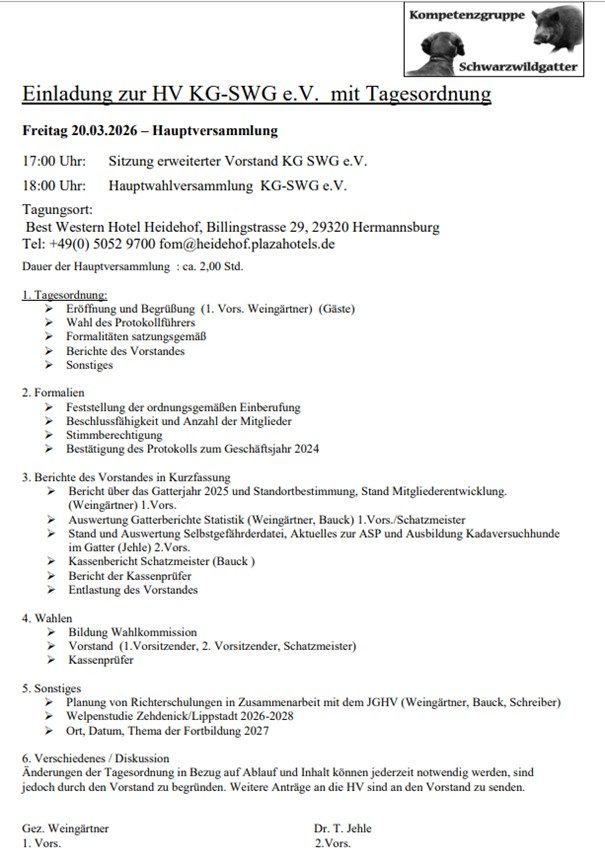 Vom 20. bis 22. März 2026 treffen sich die Mitglieder der Kompetenzgruppe Schwarzwildgatter und Gattermeister zur jährlichen Hauptversammlung und Fortbildungsveranstaltung, die dieses Mal in Hermannsburg (Niedersachsen) stattfindet.